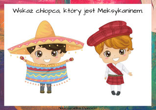5. „Skąd jesteś?”- zabawa dydaktyczna. Wspólnie oglądamy obrazki przedstawiających dzieci z różnych stron świata w tradycyjnych ubraniach. Rodzic czyta polecenie, zadaniem dziecka jest wybranie odpowiedniej postaci. Wspólnie opisujemy tradycyjne stroje dzieci.